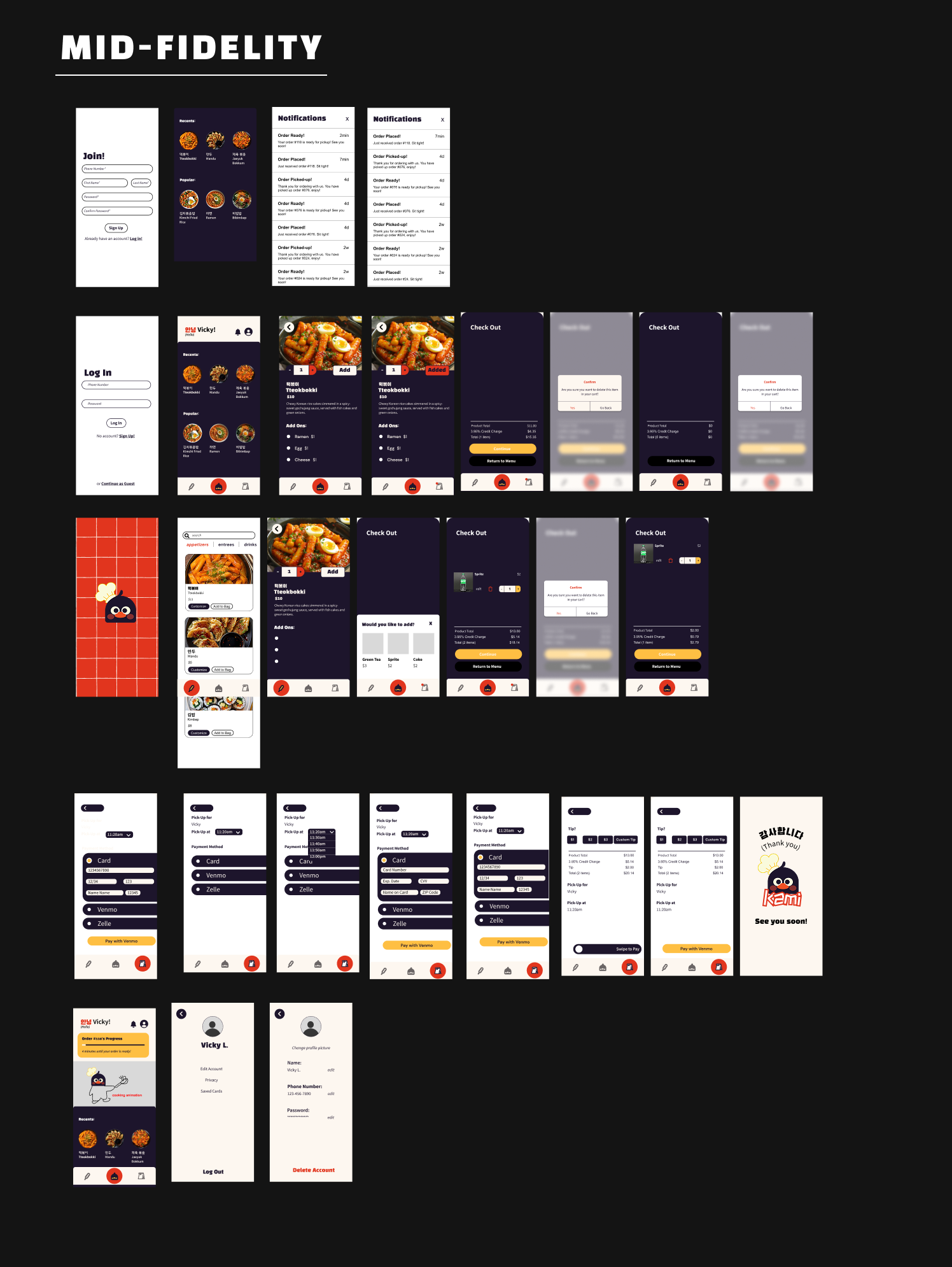 This feedback shaped everything going into high-fidelity. We stripped out the unnecessary complexity, made the food the visual focus, added pickup time info to the checkout flow, and swapped the dark theme for a less dramatic, inviting color palette that matched Kami's brand.